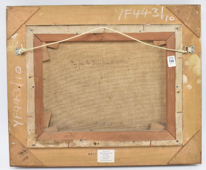 A 19th century British School oil on canvas landscape painting titled ' Far from the Busy Haunts of Men '. The painting depicting a a river scene with mountain peak in the background. Unsigned. Titled to back of canvas. Framed.