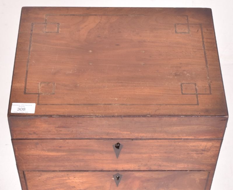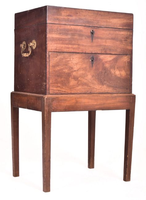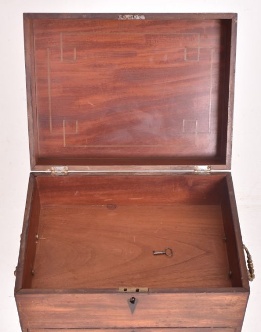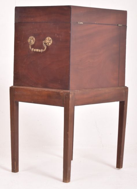 A George III early 19th century mahogany inlaid chest box on stand. The box on stand having a hinged top opening to reveal a spacious interior. Front drawer below. Twin brass handles to sides. All raised on four squared tapering supports.