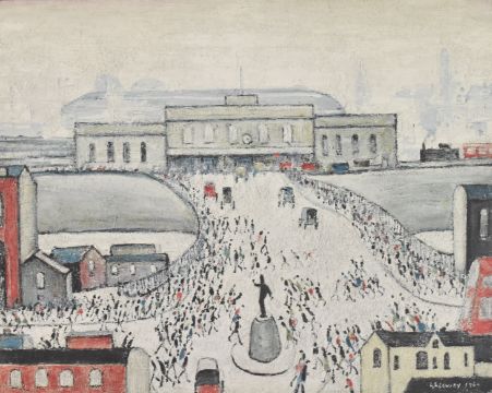 After Laurence Stephen Lowry RBA, RA (British, 1887-1976) - Station Approach - a signed colour reproduction lithograph. Signed lower right. Blindstamp for the Fine Art Trade Guild to lower left. Mounted, framed & glazed.