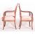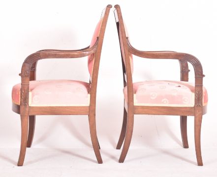 A pair of French Empire 19th century flame mahogany fauteuils - armchairs. Each having a padded back rest over scrolled elbow rests with reeded fronts. Cushioned seat all raised on splayed squares supports. All upholstered in red fabric with gilt laurel crown motifs.