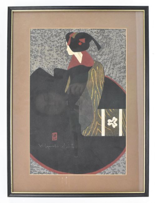 Kiyoshi, Saito (Japanese, 1907-1997) - "Maiko Kyoto" - A signed woodblock print of a young apprentice Geisha. Red seal stamp with pencil signature. Mounted, framed and glazed.