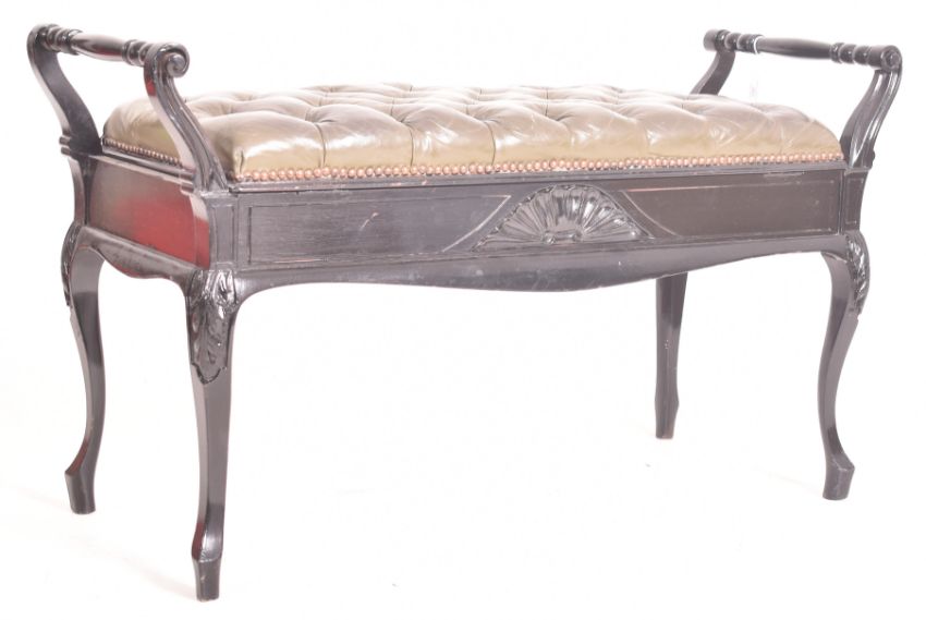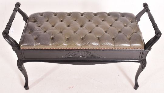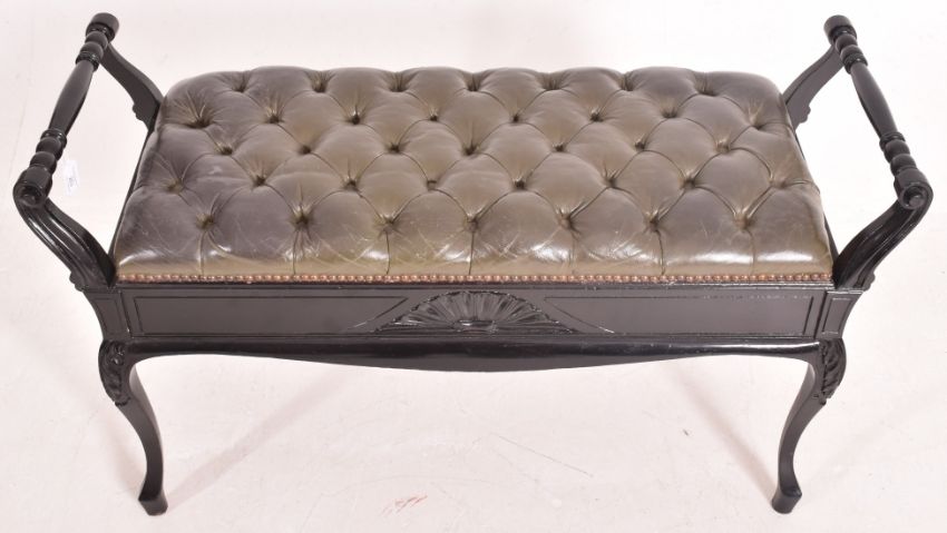 Jas Shoolbred & Co - a late 19th century Victorian ebonised walnut piano stool / bench. The seat having a green leather button top flanked by turned handles. The seat top being hinged opening to reveal storage space within. All raised on sabre supports. Label to the underside.