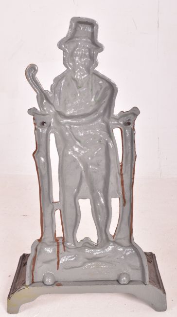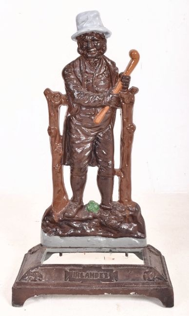 A 19th century Irish cast iron stick stand. The stickstand in the form of a man holding a shillelagh with a drip tray and inscribed 'Ireland' to the front. Over painted.
