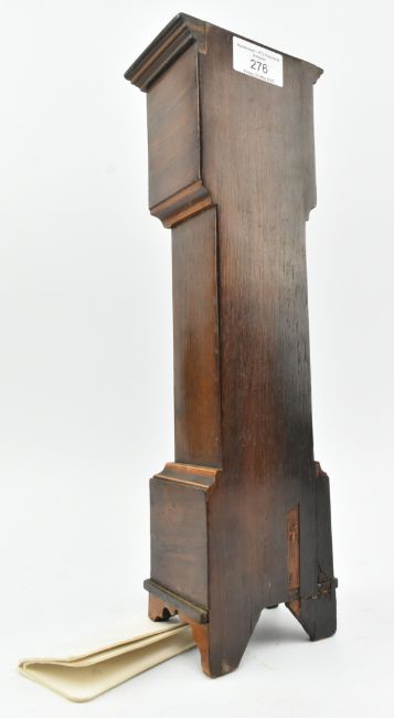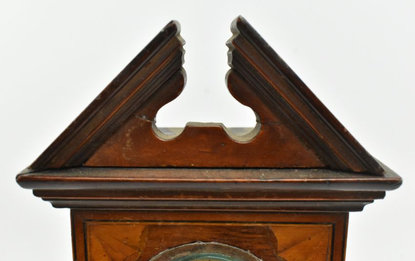 A late 19th / early 20th century mahogany and satinwood inlaid apprentice miniature longcase clock. The clock having a canted pediment atop over an inlaid face with central clock face. Straight body below, raised on bracket feet.