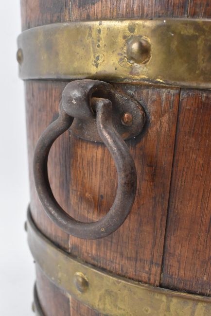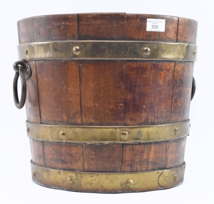 A Victorian 19th century coopered oak wood apple bucket. The bucket of cylindrical tapering form with studded brass bounds and twin ring handles.