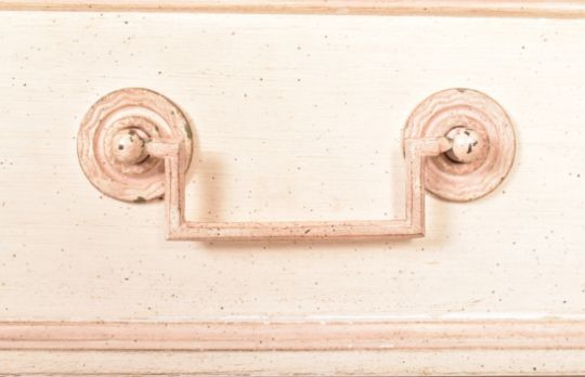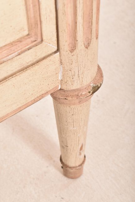 A large 20th century French Louis XVI style sideboard / chest of drawers. The chest having a bank of nine drawers flanked by reeded columns with all raised on tapering supports. All finished in off white.