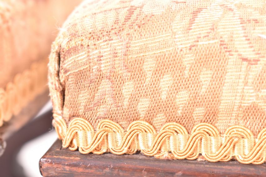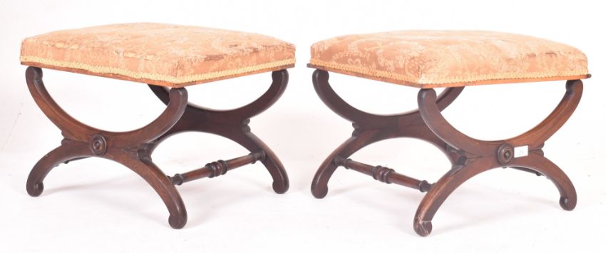 A pair of believed Gillows of Lancaster early 19th century rosewood X frame foot stools . Each seat having a padded upholstered seat all raised on curved X frame supports with roundel details to centre and united by turned stretchers.