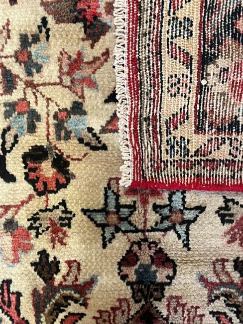 A 20th century North West Persian Islamic Mahal floor carpet rug. The rug having a central cream & black medallion decorated with floral motifs, enclosed within a pink ground central panel. Series of outer borders with short tassels to ends.