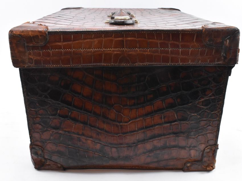North West Tannery Co. - an early 20th century Edwardian crocodile leather vanity suitcase. The case complete with matched brush box & concertina wallet case. Spare leather loosely inserted. Complete with key.