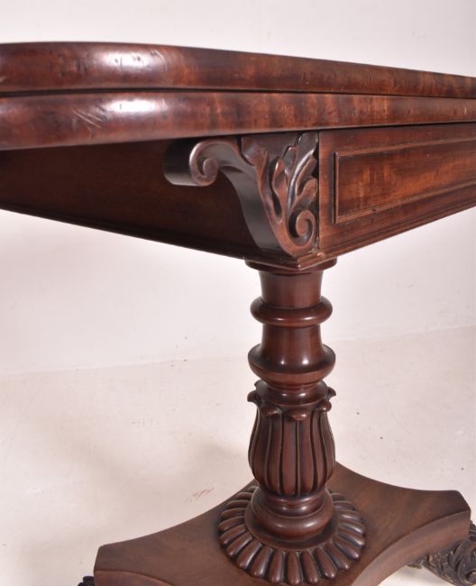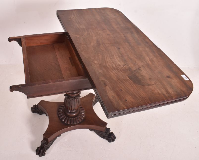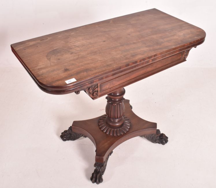 A William IV early 19th century rosewood felt top card games table. The table having a fold out top with curved edges and shaped fitted frieze to front. Central turned column with inverted leaves motif and gadrooned base. All raised on quadruple base with hairy paw feet.