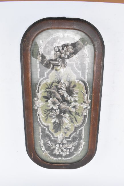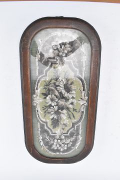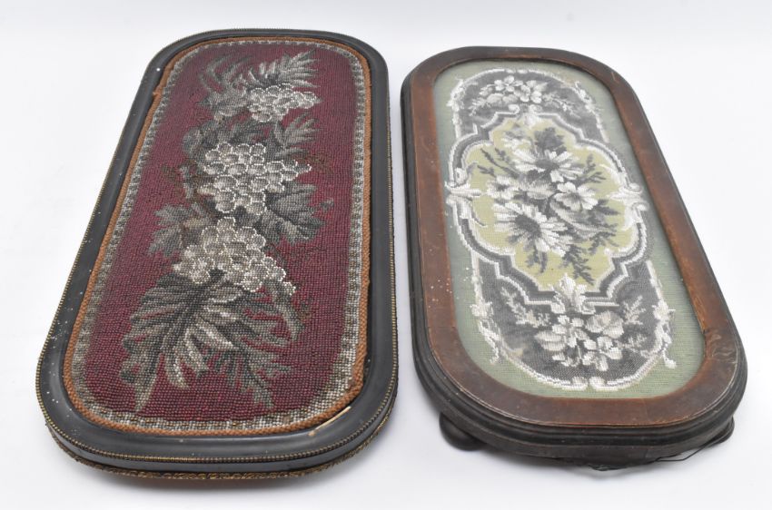 Two 19th century Victorian beaded dome stands raised on bun feet. The lot comprising a Hogarth style ebonised & gilt example with central grape & foliage scene on red ground; and a mahogany framed example featuring floral cartouche central with floral surrounds on green ground.