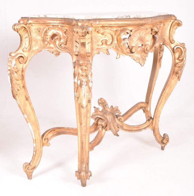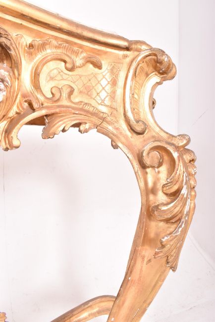 A French Louis XIV inspired 18th century giltwood & gesso console hall table. The console table having a shaped marble over an intricately carved fitted frieze with relief foliate & floral motifs. Accentuated cabriole legs with further foliate swags to centre, all united by cross central stretcher.