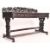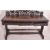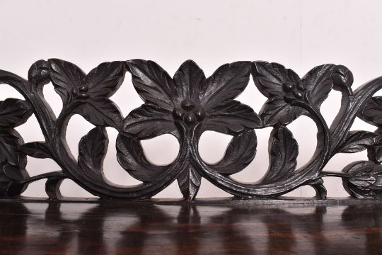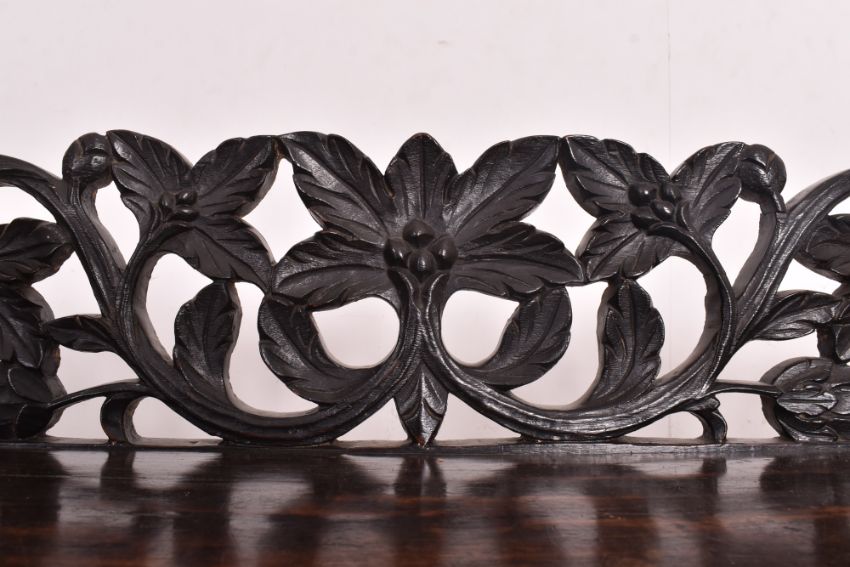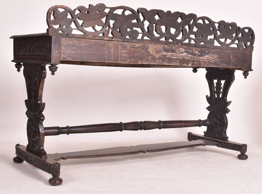 An Anglo - Indian Colonial mid 19th century believed padouk wood console hall table. The table having a pierced carved gallery back over a rectangular top with gadrooned edges. Bank of three twin handled drawers with foliate motifs to front. Raised on carved lyre shaped supports with further matched decoration, united by turned stretcher. All raised on pedestal supports with further central stretcher on pad feet.