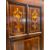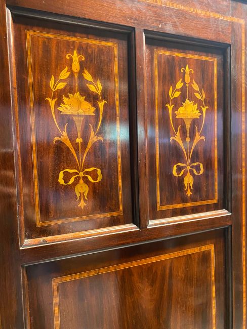 An Edwardian mahogany & boxwood inlaid triple compactum. The wardrobe having a flared pediment atop over a central mirrored front door flanked by single doors. Each side door having three boxwood and laurel inlaid panels with floral swags. Plinth base.