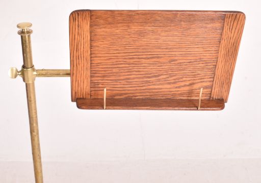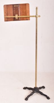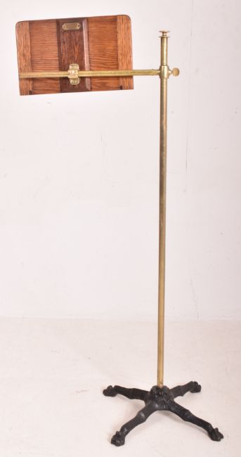 J. Foot & Son Ltd - a High Victorian 19th century music / reading lectern. The lectern being of adjustable height, with cast iron stand base of four legs with paw feet having a brass adjustable height column. Finished with an oak lectern sheet stand with base. Label to the verso.
