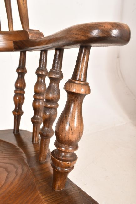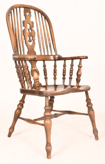 A 19th century revival elm Windsor armchair. The chair having a curved railed backrest with shaped elbow rests. All being raised on on turned legs united by an H-stretcher with saddle seat above.