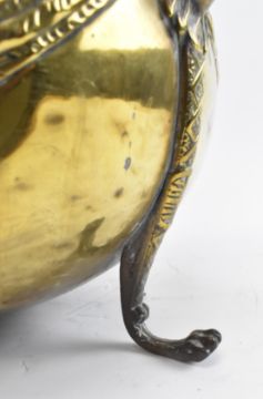 A 19th century Victorian brass repousse jardiniere plant stand. The planter of cauldron form, featuring repousse crest & swags with floral centrepieces. Raised on three legs with lion's head finial, over curved paw feet.