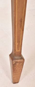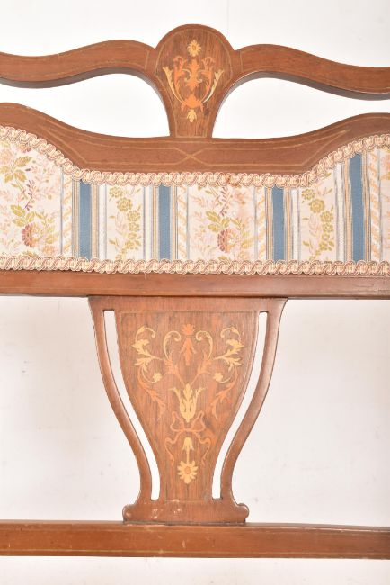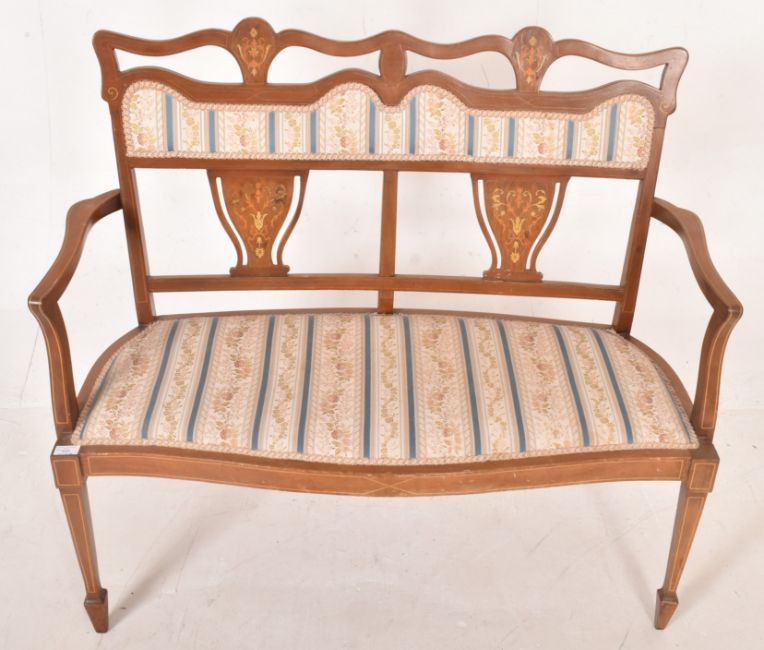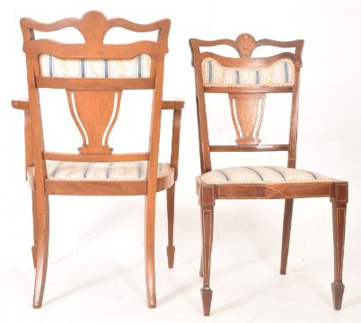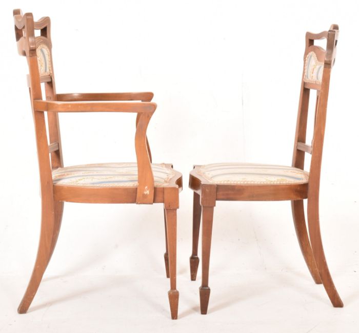 An Edwardian Sheraton Revival inlaid mahogany six-piece parlour suite comprising a two-seater sofa settee and five armchairs. The suite having mahogany open frames with inlaid patterns throughout. Padded and upholstered seat rests with each raised on turned reeded front legs and splayed back supports.