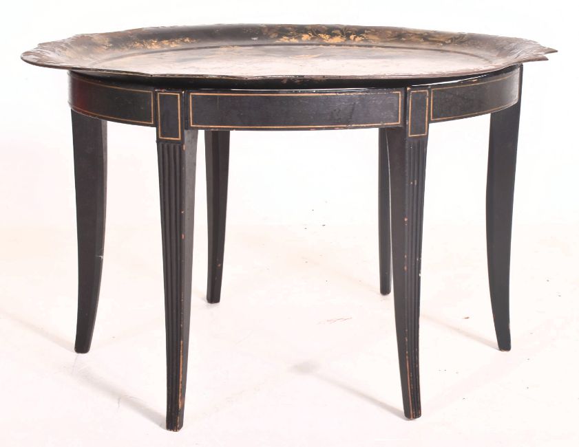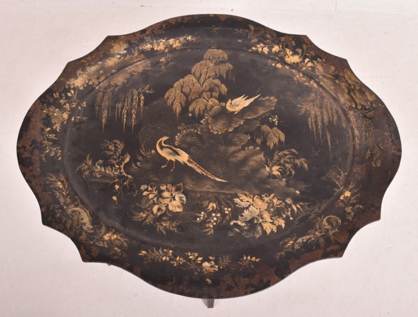 An early 19th century painted Chinoiserie Japanned toleware tray. The tray table of oval form having a serpentine scalloped edge with scenes depicting birds of paradise among blossoming trees. The tray raised on a later ebonised stand with gilt borders.
