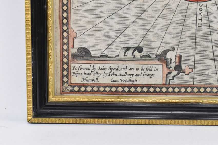 British maps:- Speed, John & Hondius. 1610 Anglesey, Part of Carnarvanshyre. Antiently called Mona. Described 1610. Performed by Iohn Speed, and are to be sold in Popes-head alley by Iohn Sudbury and George Cum Privilegio. Hand coloured engraved map, central fold line, cartouche upper left hand corner & vignette plan of Beamaris upper right, compass lower left hand. Jodocus Hondius Celavit Anno Domini 1610. Leaves visible to rear. From Theatrum imperii Magnae Britanniae, 1616. Framed & glazed in double sided Hogarth frame.