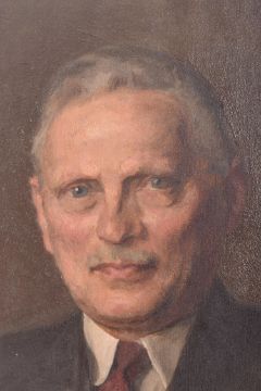 A large English Portraiture School mid 20th century oil on canvas painting of believed military man. The portrait depicting man in three piece suit and badge with hand resting on chair. Signed with illegible monogram to lower right. Dated 1944. Unframed.