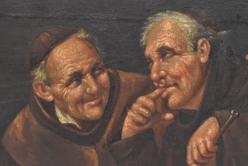 After Raffaele Frigerio (Italian, 1875-1948) - Due Frati in Cucina (Two Monks in the Kitchen) - an early 20th century oil on canvas painting after Italian painter Raffaele Frigerio. The painting depicting two monks cheekily eating from a copper pot. Illegibly signed to lower right. Framed.