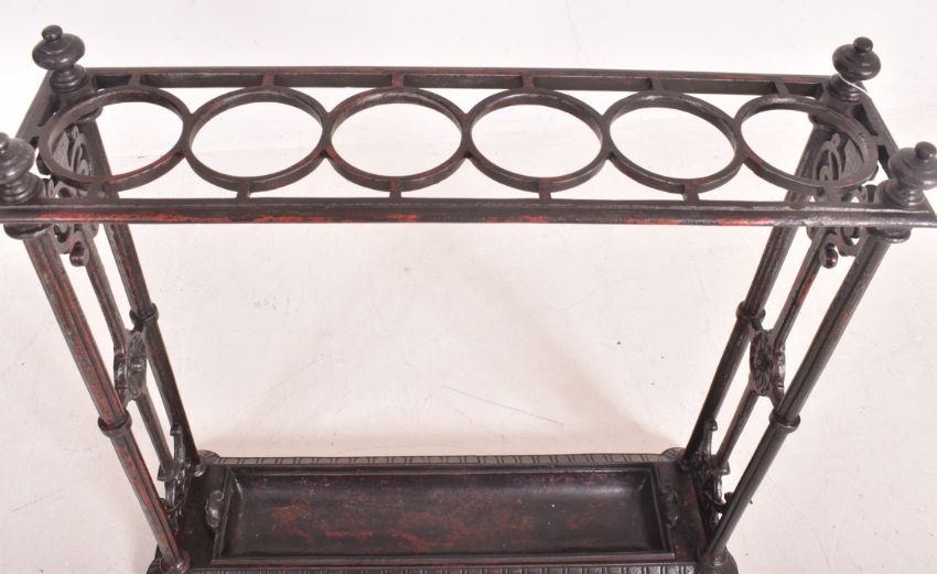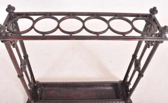 A late 19th century Victorian Coalbrookedale cast iron stick stand. The stand of rectangular form having six section circular top with finials to each corner supported by iron-worked sides. All raised on a gadrooned plinth base. Drip tray present. Impressed numbers present.