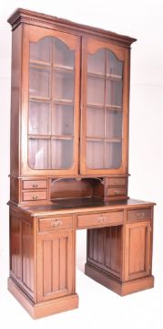 A late Victorian large mahogany office estate bookcase on twin pedestal desk. The desk having an upper section having two glazed doors housing shelves within with four small drawers below flanking a central recess. The base having a green leather writing skiver with a central kneehole recess and drawers. All raised on a twin pedestal base.