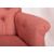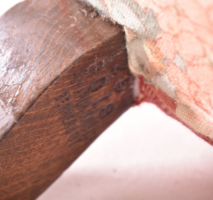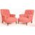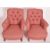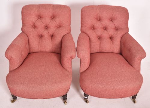 Howard & Sons of London - A pair of mahogany framed armchairs. Each upholstered in pink / red fabric. Each having a padded buttoned backrest over a c-scrolled elbow rest. Padded seat, all raised on turned front legs and squared back supports. Back left support stamped to inside. All raised on brass castors each stamped.