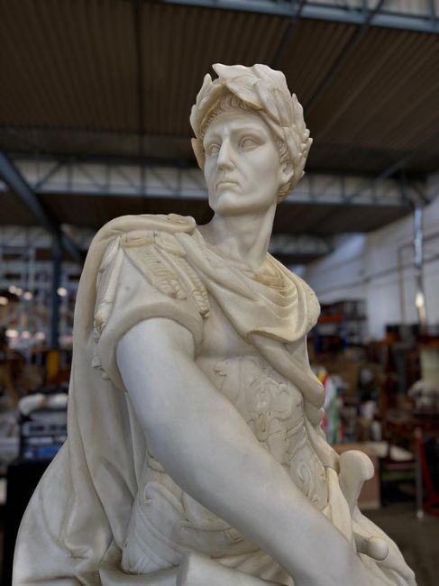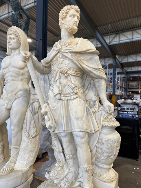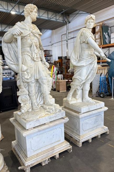 A large pair of late 20th century carved solid Carrara white marble figures of Roman legionary soldiers. Each represented in full armour and cape, holding various objects / weaponry. Each raised on stepped plinth bases.This lot is ONLY available for viewing by appointment, address to follow upon request. Collection from an alternative address, disclosed upon purchase. Each measures approx. 200cm tall including base.