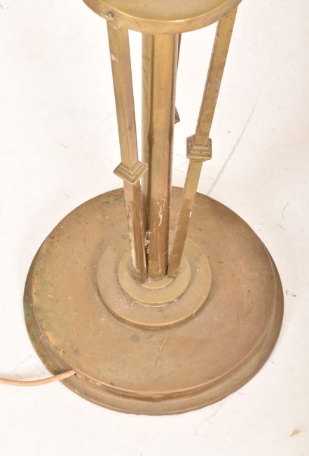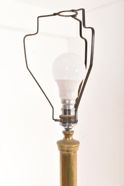 A 20th century Edwardian brass floor-standing lamp light. Singular brass column supported by a tripod brass base. All raised on a circular foot.