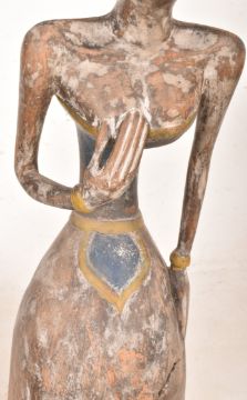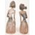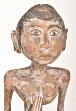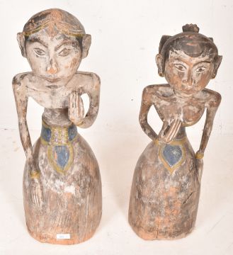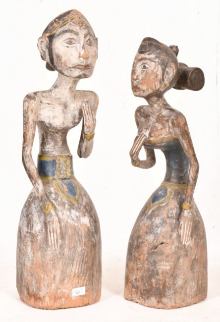 A Loro Blonyo Javanese hand-painted carved hardwood bridal couple figures. The pair of figures depicting a male and female statue with matching traditional garments in yellow and blue colourways.