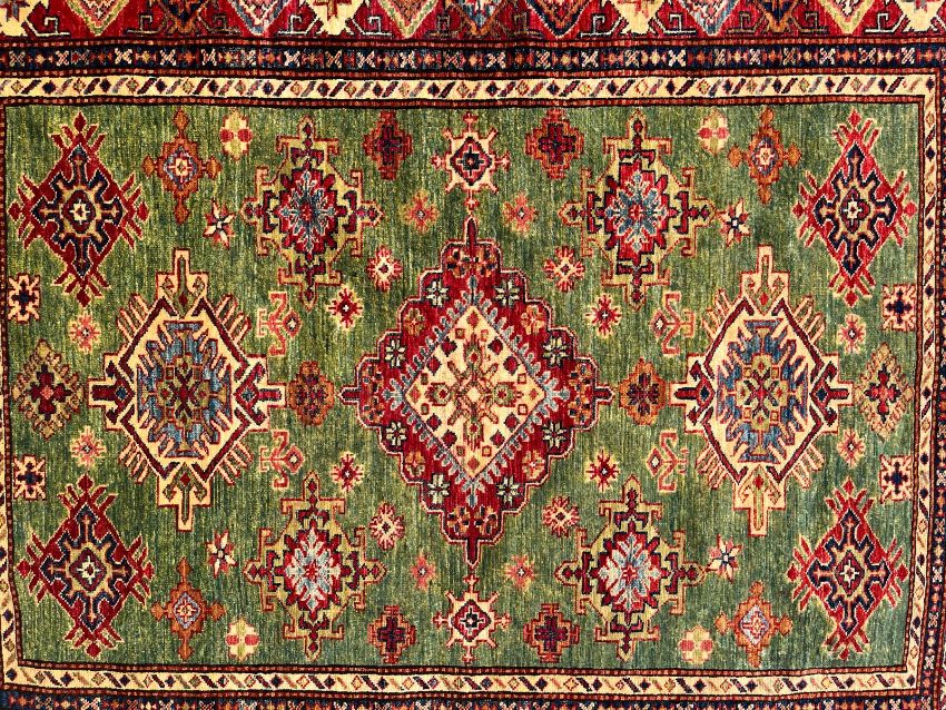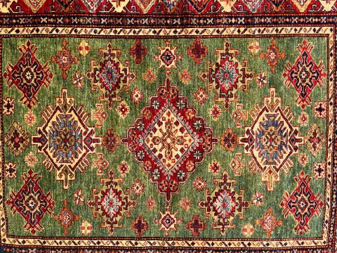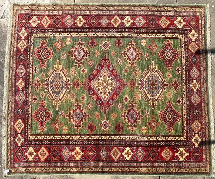 A late 20th century Afghan Kazak floor carpet rug. The carpet having a central green ground panel with three central medallion surrounded by smaller similar motifs. All enclosed within red ground outer border with further matching decorations. Short tassels to ends.