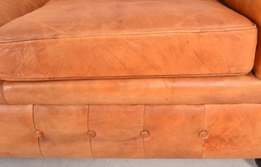 A 20th century large Chesterfield tan leather button-back three seater sofa settee. The sofa with scrolled arms and backrest with buttoned detailing throughout. Upholstered in tan brown leather. All raised on bun feet supports.