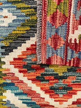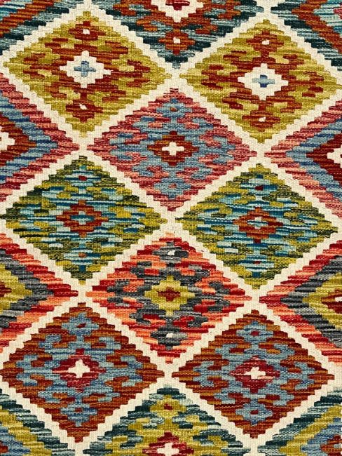 A 20th century Anatolian Turkish Kilim floor carpet runner rug. The runner rug having a central panel with polychrome diamond-shaped decorations all enclosed within an optical illusion outer border. Short tassels to ends.