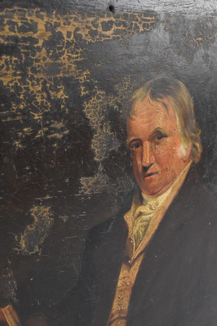 After William Douglas (British, 1780-1832) - a 19th century oil on board portrait of John Beugo, the Scottish engraver and printmaker. The portrait depicting the subject sitting and holding a book on his lap. Unframed.