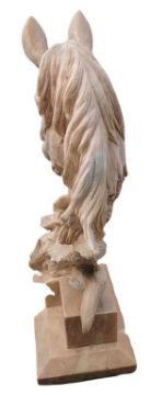 A large contemporary 21st century carved sunburst marble outdoor/garden decorative horse head sculpture. The statue depicting a horse head in profile with tree trunk to base. All raised on stepped plinth base.This lot is ONLY available for viewing by appointment, address to follow upon request. Collection from an alternative address, disclosed upon purchase. Measures approx. 100 cm x 60cm x 40cm.