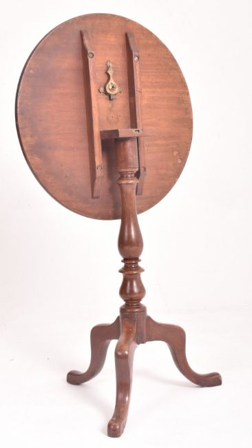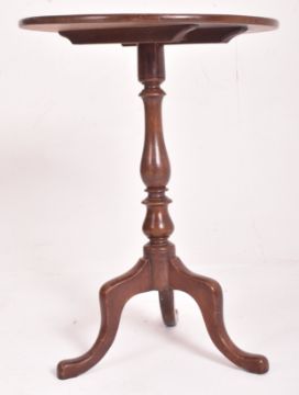 A 19th century mahogany tilt top tripod side / wine table. The table having a circular tilt top with brass mechanism to underside. All raised on turned central column with splayed tripod supports.