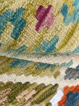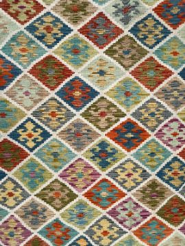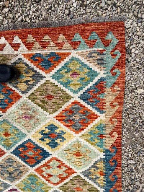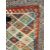 A 20th century Anatolian Turkish Kilim floor carpet rug. The carpet having a series of diamond shaped polychrome motifs to central panel in green, blue yellow and orange. Matching outer border with short tassels to ends.