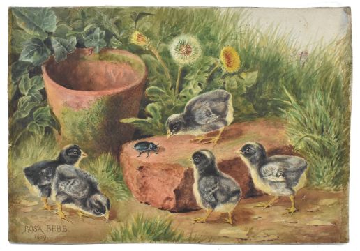 Attributed to Minnie Rosa Bebb (British, 1857-1945) - a late 19th century 1889 watercolour on cardboard painting of baby chicks and beatle. Signed & dated lower left. Unframed.