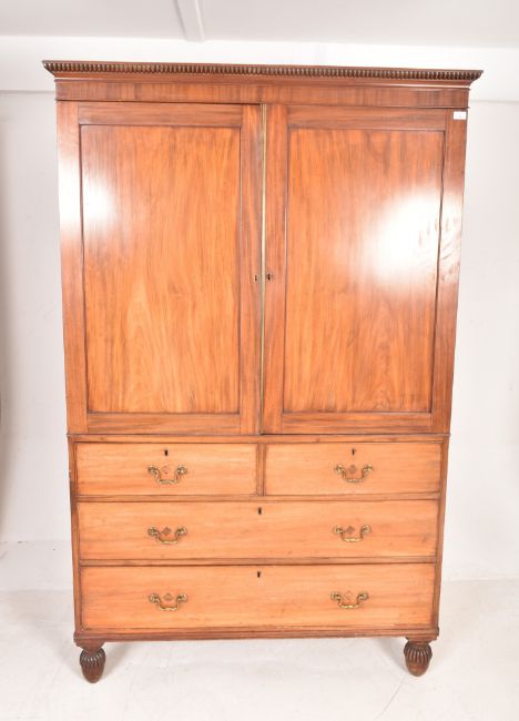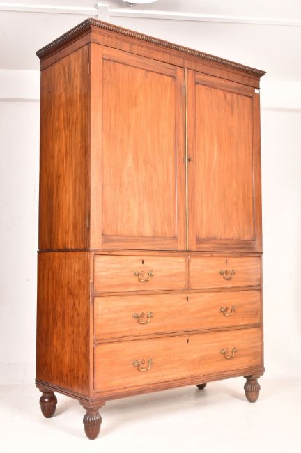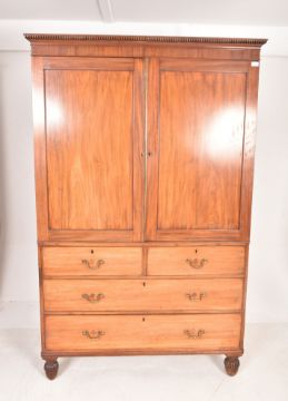 A George III 19th century mahogany linen press. Raised on bun feet with chest of drawers under linen cabinet atop. Complete with slides.