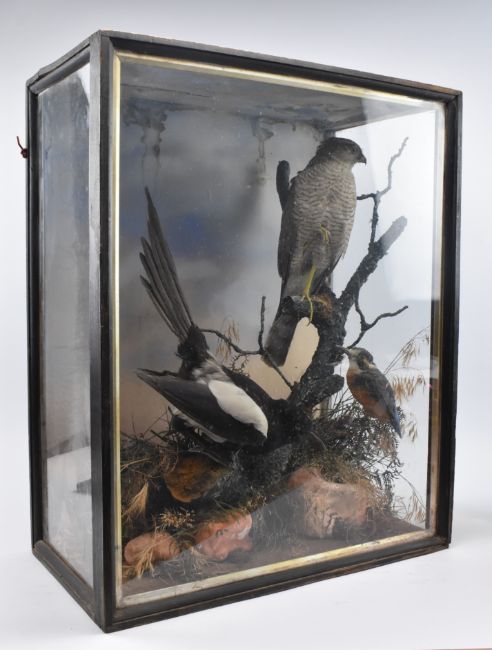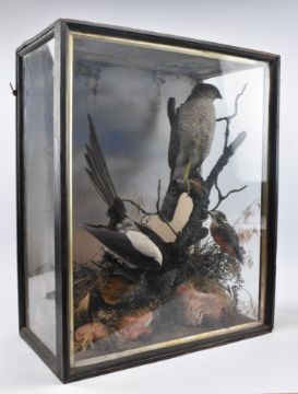Taxidermy. A late 19th century Victorian cased taxidermied display of a Kingfisher Alcedo atthis, Sparrowhawk Accipiter nisus and Magpie Pica birds. Each bird perched atop branch with naturalistic backdrop. Presented in ebonised & glazed case.Not suitable for export. Case measures approx. 64cm x 52cm x 29cm.