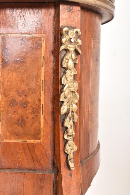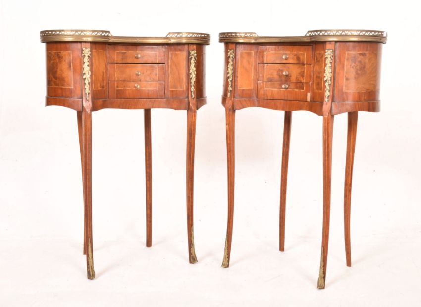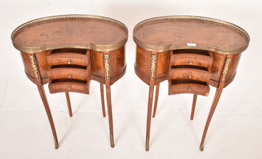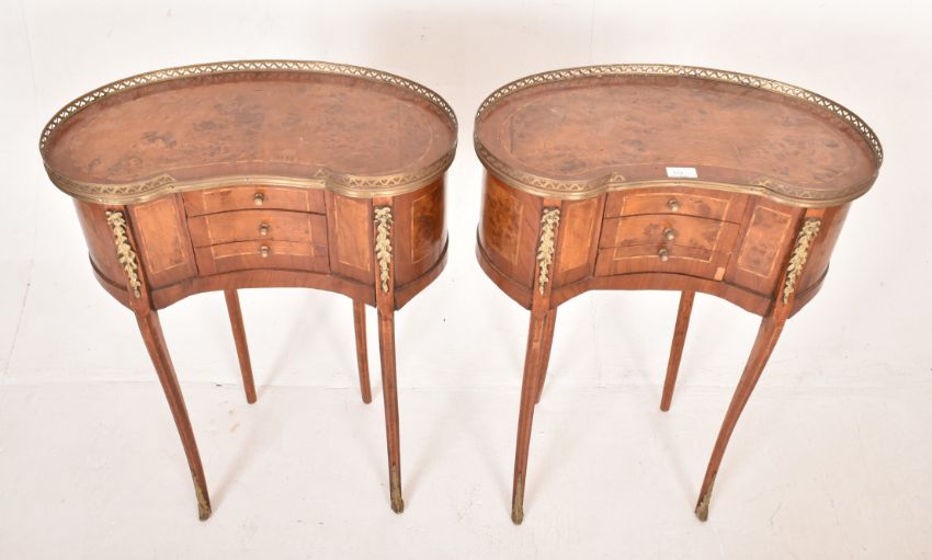 A pair of French Louis XVI inspired 19th century revival burr walnut & ormolu kidney shaped bedside tables. Each having a brass pierced gallery surround, bank of three single handled drawers below flanked by burr walnut inlaid panels and floral ormolu embellishments. All raised on cabriole supports with brass details to ends.