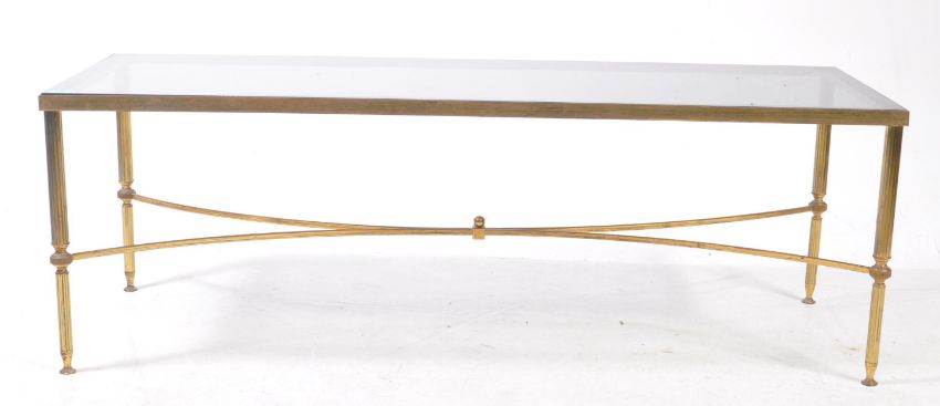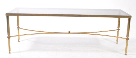 Italian Modern Design - A vintage 20th century metal and glass long john style coffee table. The table having gilt brass tone frame, with curved stretcher to underside. Raised on tapered supports. Smoked glass top. Measures approx: 40x120x45cm