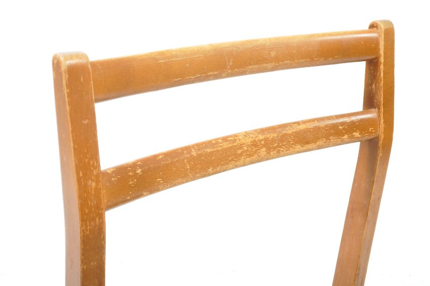 British Modern Design - A set of black vinyl teak dining chairs. Slat back on vinyl padded seat with tapering legs with front stretcher. Measures approx: 75x45x40cm