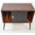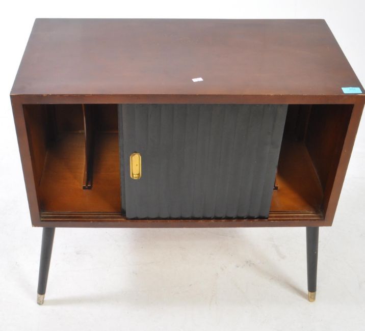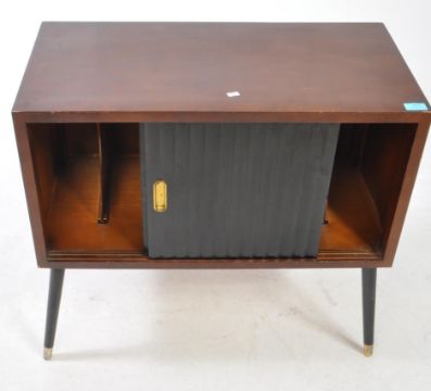 A vintage 20th century teak record vinyl cabinet. Having ebonised sliding doors fitted interior on tapering tapering legs. Measures approx: 69x64x37cm