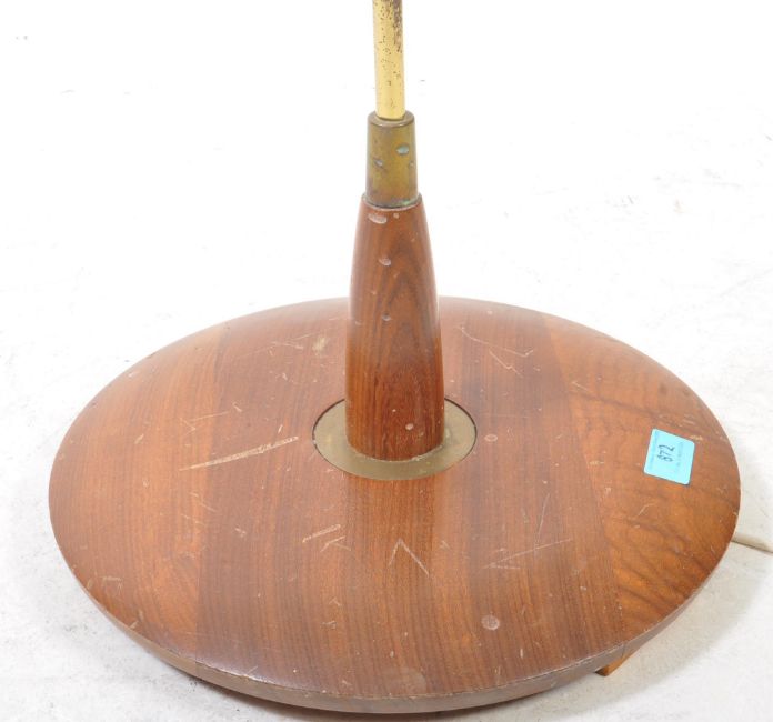 British Modern Design - A mid century teak and brass floor standing standard lamp. Light fixing to top, brass central column with teak stylised panel on a circular foot. Measures approx: 140x30x30cm