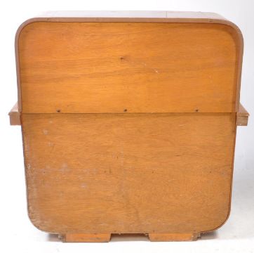 A 20th century post war Ritz of London art deco walnut cocktail drinks cabinet bar. The cabinet with etched glass twin sliding doors to top, two glass doors below and extendable mirrored shelf with two knob handles. Numbered 867886 to the makers plaque. Measures approx: 108x107x35cm