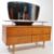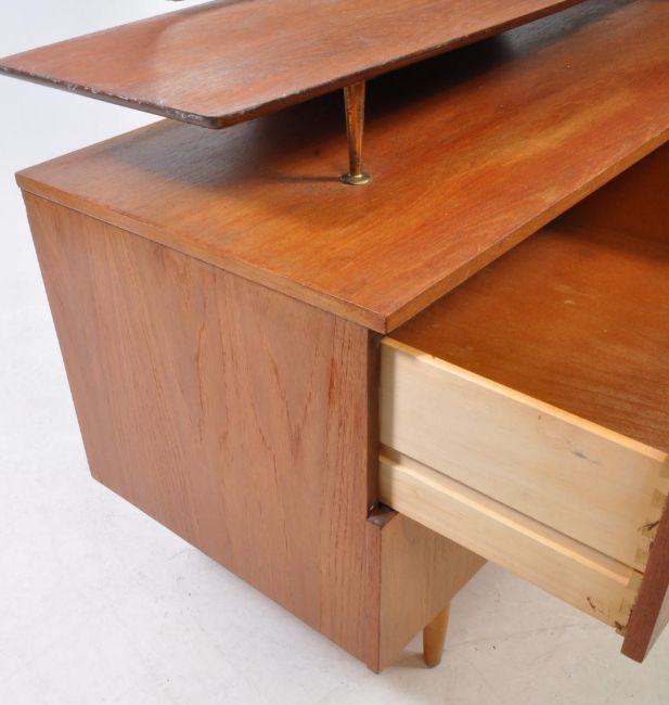 British Modern Design - A mid 20th century teak dressing table. The dresser raised on tapering legs, having a series of drawers to lower. Featuring a shaped mirror atop. Measures approx: 124x122x46cm