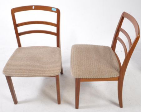G Plan Furniture - A set of four white upholstered dining chairs. Teak slat back on tapering supports with white upholstered padded seat. Measures approx: 80x47x49cm